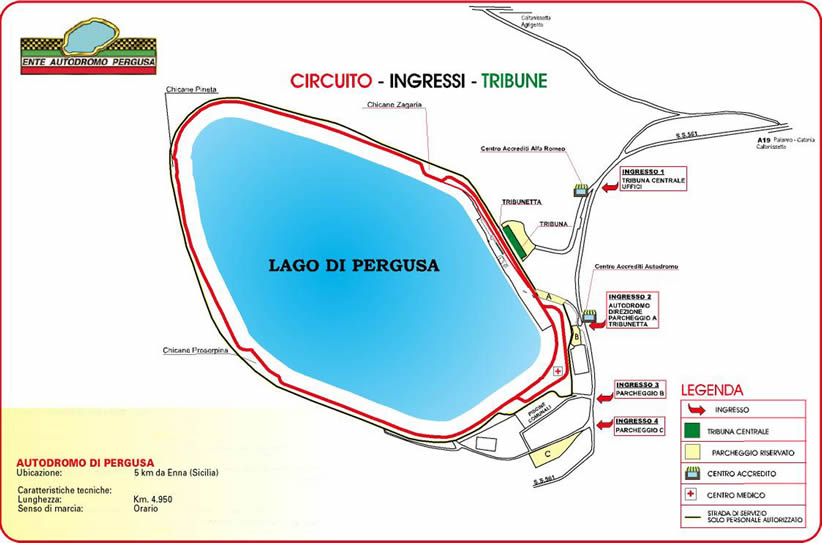 L’Autodromo di Pergusa è situato nel cuore della Sicilia, vicino alla città di Enna. E’ stato costruito nel 1951 e da allora ha ospitato numerosi eventi nazionali e internazionali. Il veloce tracciato si snoda lungo le rive di un lago, ed è caratterizzato da lunghi rettifili e strette varianti, non presenti originariamente ma create per ragioni di sicurezza. I punti più spettacolari della pista sono senza dubbio le tre difficili varianti “Proserpina”, “Pineta” e “Zagaria” che impongono frenate importanti e una grande agilità nei cambi di direzioni.